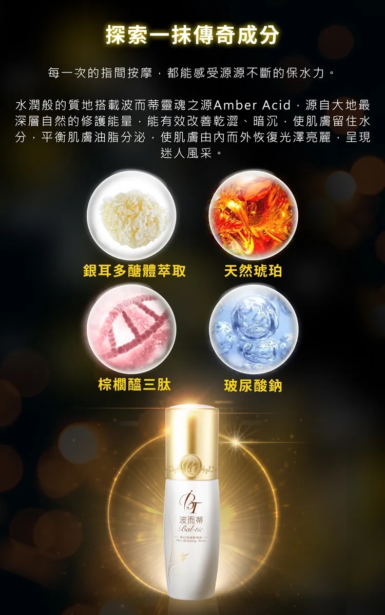 凍凝時光的琥珀精華與銀耳多醣體結合,輕透水潤的深層修護以大地千萬年的Amber Acid蛻變肌膚。指尖的每一圈按摩,都能感受到源源不絕的保濕力,來自珍貴礦石的醒膚能量,撫平乾燥肌膚,為您開啟美麗肌齡。