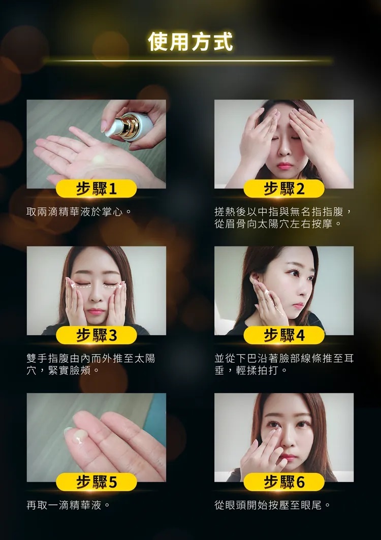 ➋取兩滴精華液於掌心,搓熱後以中指與無名指指腹,從眉骨向太陽穴左右按摩。
